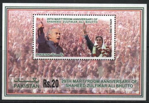 4 اپریل 2008ء کو پاکستان کے محکمہ ڈاک نے پاکستان کے سابق وزیراعظم اور پاکستان پیپلزپارٹی کے بانی ذوالفقار علی بھٹو کی انتیسویں برسی کے موقع پرایک یادگاری ڈاک ٹکٹ اور ایک سووینئیر شیٹ جاری کی جن پر ان کی اور ان کی صاحبزادی محترمہ بے نظیر بھٹو کی تصاویر شائع کی گئی تھیں اور انگریزی میں 29th MARTYRDOM ANNIVERSARY OF SHAHEED ZUFIKAR ALI BHUTTO APRIL 4, 2008 کے الفاظ تحریر تھے۔ اس ڈاک ٹکٹ اور سووینئیر شیٹ کی قیمت بالترتیب چار روپے اور بیس روپے تھی اور ان کا ڈیزائن جناب عادل صلاح الدین نے تیار کیا تھا۔