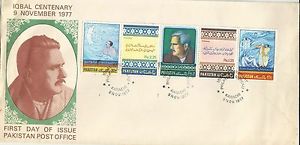 9 نومبر 1977ء کوپاکستان کے محکمہ ڈاک نے شاعر مشرق علامہ محمد اقبال کے جشن ولادت کی صد سالہ تقریبات کے حوالے سے پانچ یادگاری ڈاک ٹکٹوں کا ایک خوب صورت سیٹ جاری کیا جن کی مالیت
