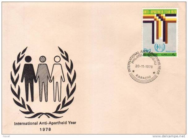 INTERNATIONAL ANTI - APARTHEID YEAR 1978 کے الفاظ تحریر تھے ۔ اس ڈاک ٹکٹ کا ڈیزائن پاکستان سیکیورٹی پرنٹنگ کارپوریشن کے ایم اے منورنے تیا رکیا تھا۔