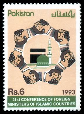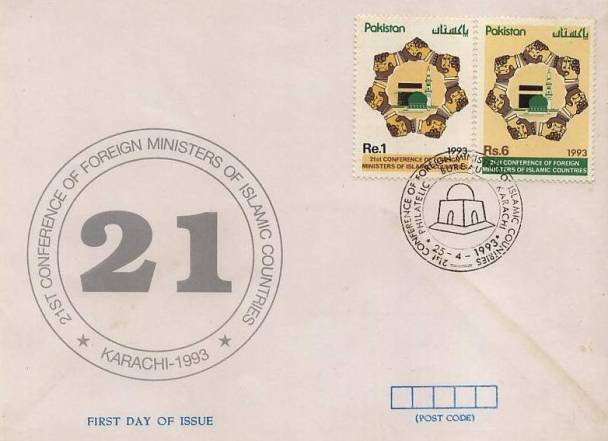 اسلامی ممالک کے وزرائے خارجہ کا اکیسواں اجلاس 25 سے 29 اپریل 1993ء کے دوران کراچی میںمنعقد ہوا۔ ا س موقع پر25 اپریل 1993ء کو پاکستان کے محکمہ ڈاک نے دو یادگاری ڈاک ٹکٹوں کا ایک سیٹ جاری کیا جن کی مالیت ایک روپیہ اور چھ روپے تھی ۔ان ڈاک ٹکٹوں پر درمیان میںخانہ کعبہ اور مسجد نبوی کی تصویریں بنی تھیں اور نیچے1st CONFERENCE OF FOREIGN MINISTERS OF ISLAMIC COUNTRIES کے الفاظ تحریر تھے ۔ یہ دونوں ڈاک ٹکٹ پاکستان سیکیورٹی پرنٹنگ پریس کے ڈیزائنر الیاس جیلانی نے ڈیزائن کیے تھے۔