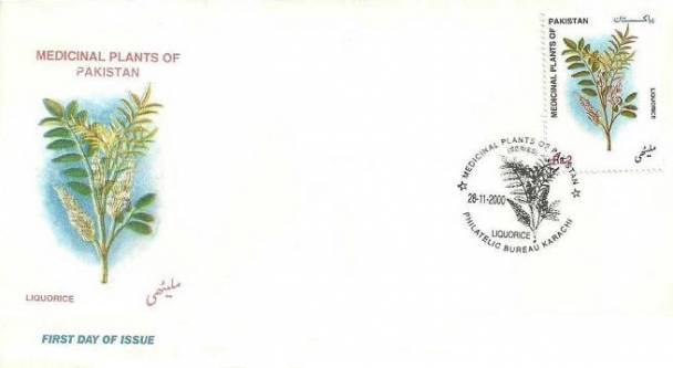 1992ء میں پاکستان کے محکمہ ڈاک نے طبی پودوں کے عنوان سے ڈاک ٹکٹوں کی ایک نئی سیریز کا آغاز کیا تھا۔ اس سیریز کا آٹھواں ڈاک ٹکٹ 28نومبر 2000ء کو جاری ہوا جس پر ملیٹھی کے پودے کی تصویر بنی تھی۔ پانچ روپے مالیت کے اس یادگاری ڈاک ٹکٹ پر اُردو میں ملیٹھی اور انگریزی میں LIQUORICE اورMEDICINAL PLANTS OF PAKISTAN کے الفاظ طبع کیے گئے تھے۔ اس ڈاک ٹکٹ کا ڈیزائن غلام عباس خاصخیلی نے تیار کیا تھا۔