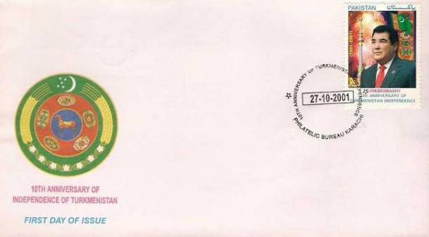 27اکتوبر2001ء کو پاکستان کے محکمہ ڈاک نے ترکمانستان کی آزادی کی دسویں سالگرہ کے موقع پر پانچ روپے مالیت کا ایک یادگاری ڈاک ٹکٹ جاری کیا جس پر ترکمانستان کے پرچم اور اس کے صدر Saparmurate Niyazov کی تصویر شائع کی گئی تھی اور انگریزی میں 1991-2001 "TURKMENBASHY" 10th ANNIVERSARY OF TURKMENISTAN INDEPENDENCE کے الفاظ تحریر کیے گئے تھے۔ اس ڈاک ٹکٹ کا ڈیزائن پاکستان کے محکمہ خارجہ نے فراہم کیا تھا۔