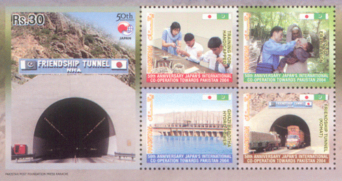 8نومبر 2004ء کو پاکستان کے محکمہ ڈاک نے مختلف ترقیاتی منصوبوں اورمختلف بیماریوں کے انسداد میں حکومت جاپان کے تعاون کی پچاسویں سالگرہ کے حوالے سے چار یادگاری ڈاک ٹکٹوں کا ایک سیٹ جاری کیا جن کی مالیت پانچ، پانچ روپے تھی۔ ان ڈاک ٹکٹوں پر ان منصوبوں کی عکاسی کی گئی تھی جن میں حکومت جاپان نے پاکستان کی مدد کی تھی۔ یہ منصوبے تھے: خصوصی افراد کی فنی تربیت، فرینڈشپ ٹنل (کوہاٹ)، غازی بروتھا ہائیڈرو پاوراور پولیو کے مرض کا انسداد۔ ان ڈاک ٹکٹوںپران منصوبوں کی عکس کشی کی گئی تھی اور انگریزی میں ان منصوبوں کے نام اورGOLDEN JUBILEE OF JAPANS ASSISTANCE FOR ECONOMIC DEVELOPMENT AND COOPERATION FOR ERADICATION OF DISEASES کے الفاظ تحریر تھے۔ ان ڈاک ٹکٹوں کا ڈیزائن عادل صلاح الدین نے تیار کیا تھا۔