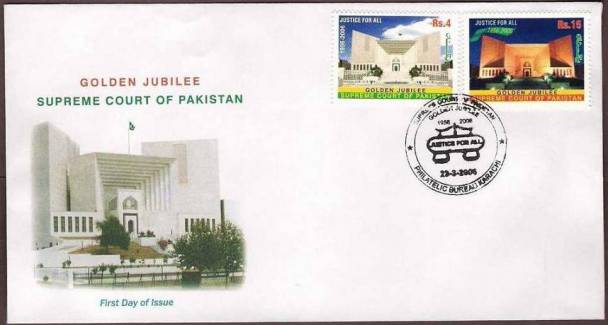 23مارچ2006ء کو سپریم کورٹ آف پاکستان کے قیام کے 50 سال مکمل ہونے پر پاکستان کے محکمہ ڈاک نے چار روپے اور پندرہ روپے مالیت کے دو یادگاری ڈاک ٹکٹ جاری کیے۔ ان ڈاک ٹکٹوں پر سپریم کورٹ آف پاکستان کی خوبصورت عمارت کی تصویر بنی تھی اور انگریزی میں JUSTICE FOR ALL اورGOLDEN JUBILEE OF SUPREME COURT OF PAKISTAN 1956 2006 کے الفاظ تحریر تھے۔ ان ڈاک ٹکٹوں کا ڈیزائن سپریم کورٹ آف پاکستان نے فراہم کیا تھا۔