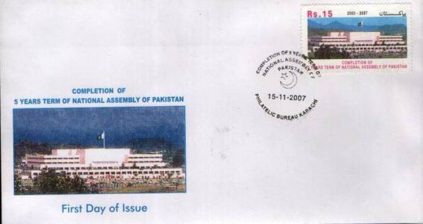 15نومبر2007ء کو پاکستان کی قومی اسمبلی کی اپنی معیاد مکمل کرکے از خود تحلیل ہوگئی۔ یہ پاکستان کی تاریخ کی پہلی قومی اسمبلی تھی جسے اپنی مدت مکمل کرنے کا موقع ملا تھا۔ اس موقع پر پاکستان کے محکمہ ڈاک نے پندرہ روپے مالیت کاایک خصوصی ڈاک ٹکٹ جاری کیا جس پر پارلیمنٹ ہاؤس کی تصویر شائع کی گئی تھی اور انگریزی میں COMPLETION OF 5 YEARS TERM OF NATIONAL ASSEMBLY OF PAKISTAN کے الفاظ طبع کیے گئے تھے۔ یہ ڈاک ٹکٹ ٖفیضی امیر صدیقی نے ڈیزائن کیا تھا۔