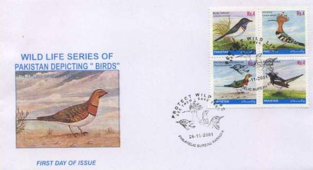 1975ء میں پاکستان کے محکمہ ڈاک نے تحفظ جنگلی حیات کے عنوان سے ڈاک ٹکٹوں کی ایک نئی سیریز کا آغاز کیا تھا۔ اس سیریز کے بیس مختلف سیٹ 1975ء اور 1997ء کے دوران جاری ہوئے۔ 2001ء میں بھی یہ سلسلہ جاری رکھا گیا اور اس سلسلے کے چار مزید ڈاک ٹکٹ 26 نومبر 2001ء کو جاری ہوئے۔ تحفظ جنگلی حیات سیریز کے ان یادگاری ڈاک ٹکٹوں پرچار مختلف پرندوں کی تصاویر بنی تھیں اور انگریزی میں ان کے نام LARGE PIN-TAILED SANDGROUSE (Pterocies alchata)،BLUE THROAT (Luscima svecica)،HOOPOE (Upupaepops اورINDIAN MAGPIE ROBIN "DHYAL" (Copsychus Sanlaris تحریر تھے۔ چار چار روپے مالیت کے ان ڈاک ٹکٹوں کا ڈیزائن غلام عباس خاصخیلی نے تیار کیا تھا۔