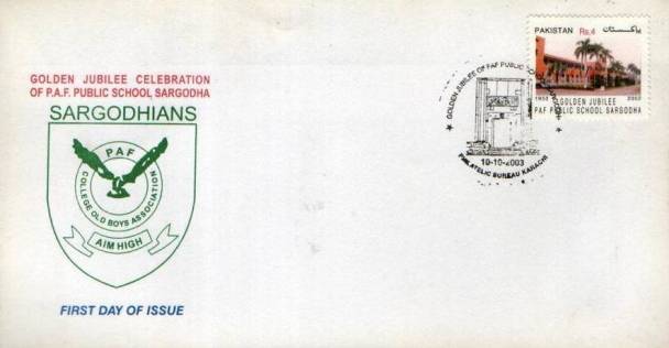10اکتوبر 2003ء کو پاکستان کے محکمہ ڈاک نے پی اے ایف پبلک اسکول، سرگودھا کے قیام کی پچاسویں سالگرہ کے موقع پر ایک یادگاری ڈاک ٹکٹ کا اجرا کیا جس پر اس اسکول کی عمارت کی تصویر شائع کی گئی تھی۔ اس ڈاک ٹکٹ پرانگریزی میں GOLDEN JUBILEE P.A.F. PUBLIC SCHOOL SARGODHA 1953 2002 کے الفاظ تحریرتھے۔ اس ڈاک ٹکٹ کی مالیت چار روپے تھی اور اسے فیضی امیر صدیقی نے ڈیزائن کیا تھا۔