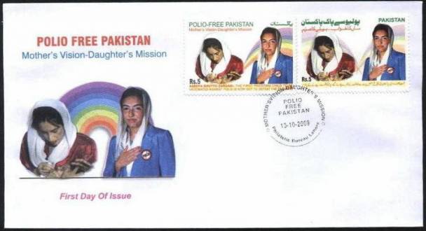 10 ۔اکتوبر 2009ء کو پاکستان کے محکمہ ڈاک نے پولیو سے آزاد پاکستان کے موضوع پر دویادگاری ڈاک ٹکٹ جاری کیے جن پرمحترمہ بے نظیر بھٹو اور ان کی صاحب زادی آصفہ بھٹو زرداری کی تصاویرشائع کی گئی تھیں۔ پانچ پانچ روپے مالیت کے ان دونوں ڈاک ٹکٹوں کا ڈیزائن جناب عادل صلاح الدین نے تیار کیا تھا۔ واضح رہے کہ پاکستان میں پولیو سے حفاظت کے قطرے پلائے جانے کی مہم کا آغاز 27 اپریل 1994ء کو محترمہ بے نظیر بھٹو نے اپنی دو سالہ صاحب زادی آصفہ بھٹو زرداری کو پولیو سے حفاظت کے قطرے پلا کر کیا تھا۔ یہ ڈاک ٹکٹ اردو اور انگریزی دونوں زبانوں میں جاری کیے گئے تھے۔ پہلے ڈاک ٹکٹ پر پولیو سے پاک پاکستان، ماں کاخواب بیٹی کا عزم اورآصفہ بھٹو زرداری ، پاکستان کی پہلی بچی جنھیں پولیو سے حفاظت کے قطرے پلائے گئے ، پولیو کو شکست دینے کے لیے پرعزم کے الفاظ تحریر تھے اور دوسرے ڈاک ٹکٹ پر اسی عبارت کا انگریزی ترجمہPOLIO FREE PAKISTAN Mother’s Vision-Daughter’s Mission اور ASEEFA BHUTTO ZARDARI: THE FIRST PAKISTANI CHILD TO BE VACCINATED AGAINST POLIO IS NOW OUT TO DEFEAT THE SCOURGE درج تھا۔