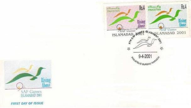 9 اپریل 2001ء کو پاکستان کے محکمہ ڈاک نے اسلام آباد میں نویں سیف گیمزکی پری لانچنگ کے موقع پردو یادگاری ڈاک ٹکٹوں کا ایک سیٹ جاری کیا جن پر نویں سیف گیمز کا لوگوبنا تھا اور انگریزی میں RISING ABOVE 9 SAF GAMES ISLAMABAD 2001 کے الفاظ تحریر تھے ۔چار چار روپے مالیت کے ان یادگاری ڈاک ٹکٹوں کا ڈیزائن سیف گیمز سکریٹیریٹ نے فراہم کیا تھا۔