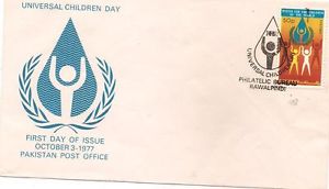 3 اکتوبر1977ء کو عالمی یوم اطفال کے موقع پر پاکستان کے محکمہ ڈاک نے 50پیسے مالیت کا ایک یادگاری ڈاک ٹکٹ جاری کیا۔ اس ڈاک ٹکٹ پر Water for the Children of the World کے الفاظ تحریر تھے اور اس کا ڈیزائن پاکستان سیکیورٹی پرنٹنگ کارپوریشن کے ڈیزائنرعادل صلاح الدین نے تیا رکیا تھا۔